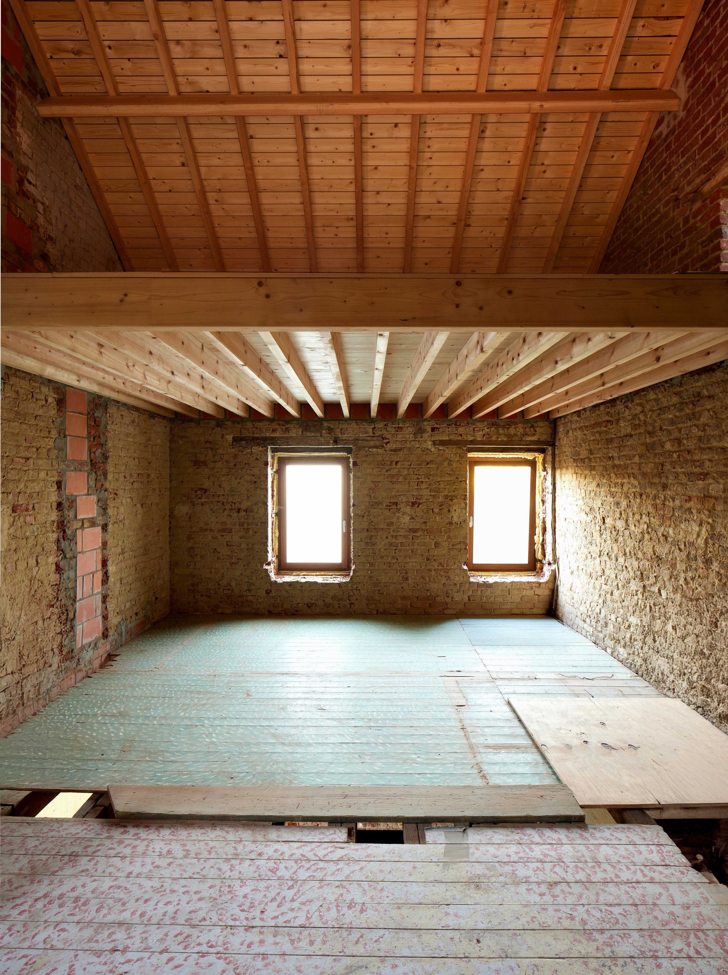 Interior construction space with exposed brick walls, unfinished wooden ceiling beams, visible wiring and pipes on the floor, large window with outdoor view, construction materials, and tools present.